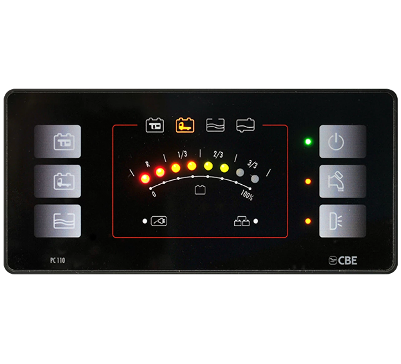 The PC110 is CBE’s latest control panel unit, with a modern LED display, dedicated buttons for common campervan functions and a microcontroller to provide extra built-in features and rapid response rates. The control panel provides both vehicle and leisure battery levels, water tank levels, 3-way fridge control and switches for water and heating control.