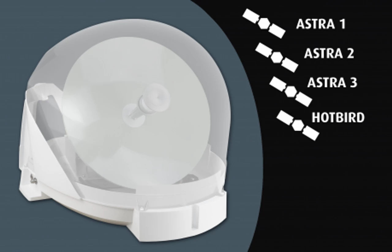 The VuQube 2 is a fully enclosed automatic satellite system designed to receive satellite TV and radio in the UK and Europe at the press of a button, using a wired control box.
