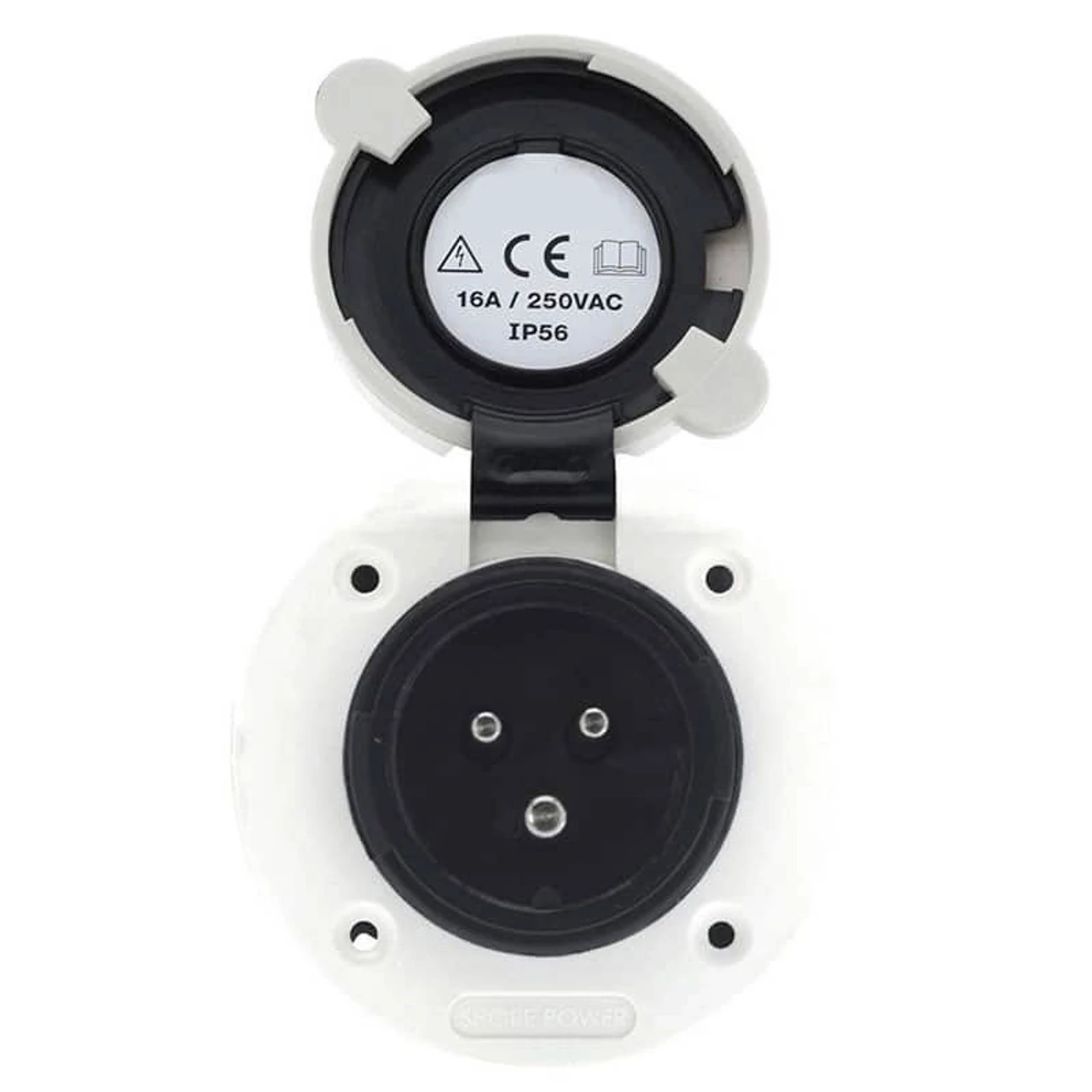 The mains power socket inlet is IP56 rated for protection from dust and strong water jets. The electrical contact blades are made from nickel-plated brass for corrosion resistance. The unit comes with full installation instructions, as well as a wiring guide.
