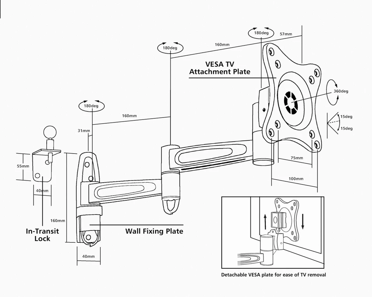 This double arm TV bracket uses a metal frame for extra strength. It is rated to hold TVs weighing up to 15kg, whilst including all the usual luxuries – an in-transit lock, detachable VESA plate and tilt by 15 degrees up or down. The arm can extend by up to 408mm away from the mounting surface, and two clips are included for cable management.